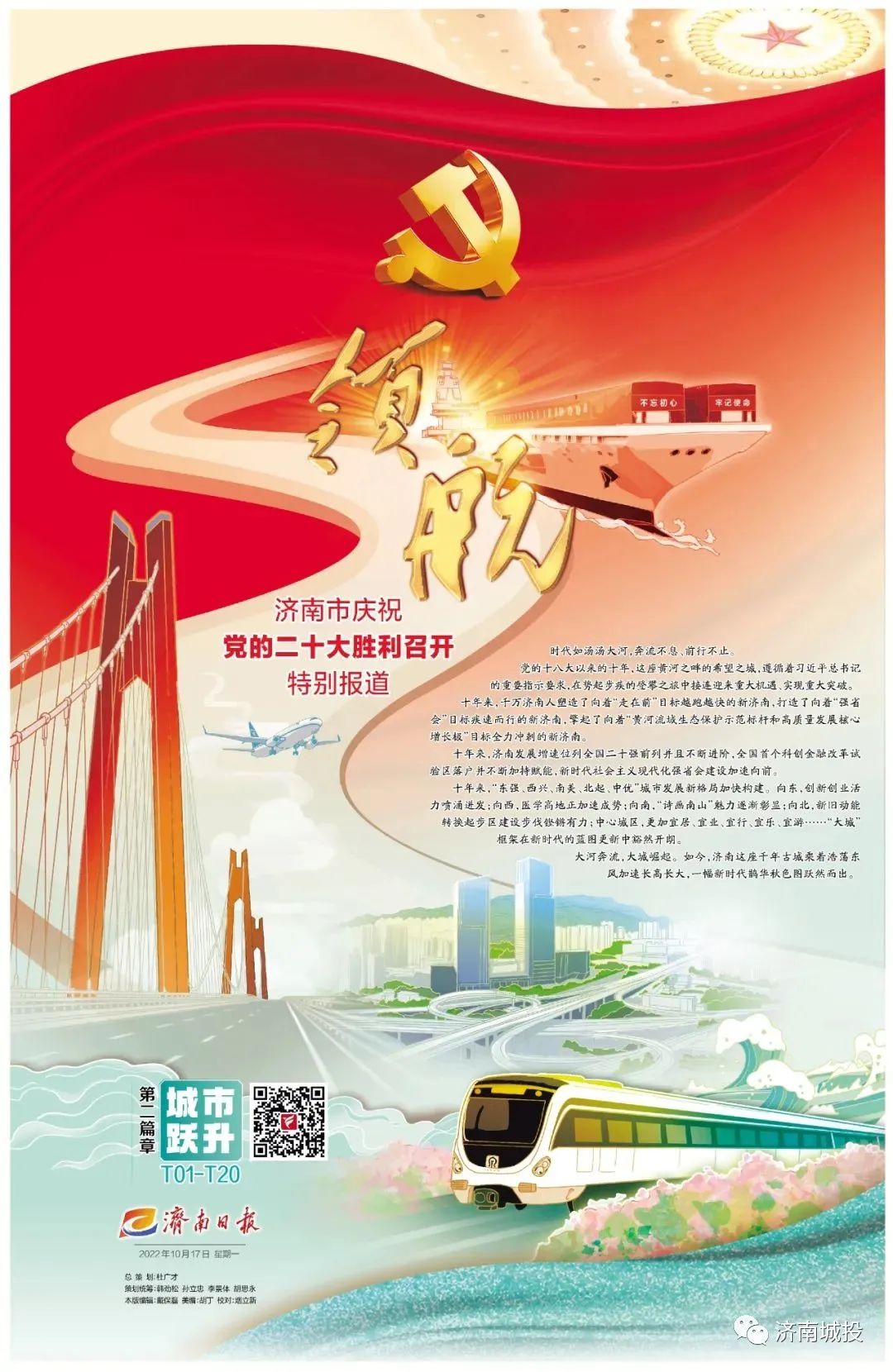 中國共產(chǎn)黨第二十次全國代表大會(huì)10月16日上午在北京人民大會(huì)堂隆重開幕。為了慶祝盛會(huì)召開,濟(jì)南日?qǐng)?bào)從16日起推出《領(lǐng)航——濟(jì)南市慶祝黨的二十大勝利召開特別報(bào)道》。
