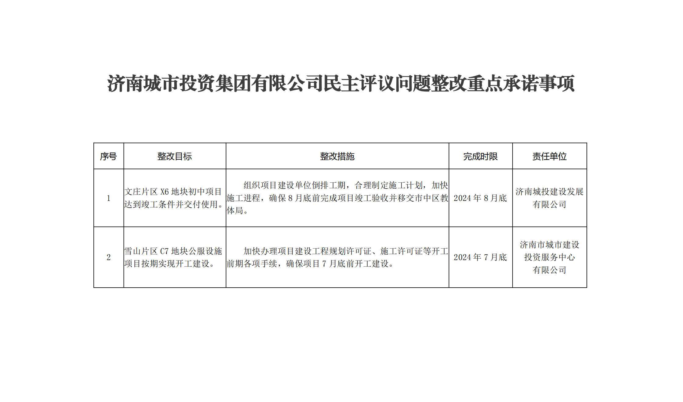 濟南城市投資集團有限公司民主評議問題整改重點承諾事項
