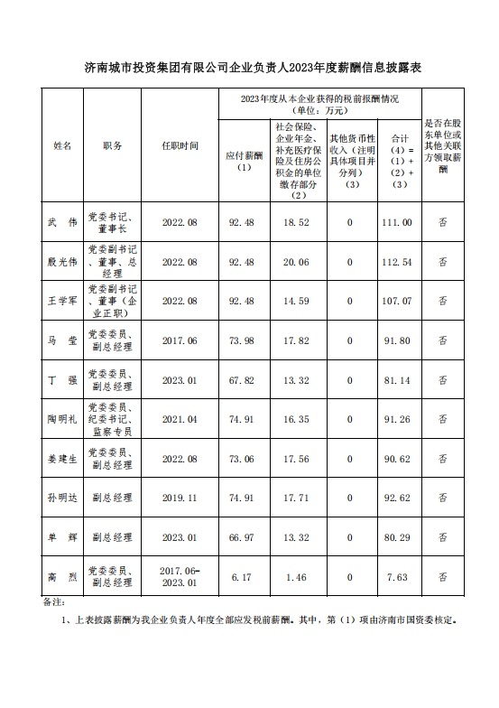 濟(jì)南城市投資集團(tuán)有限公司企業(yè)負(fù)責(zé)人2023年度薪酬信息披露